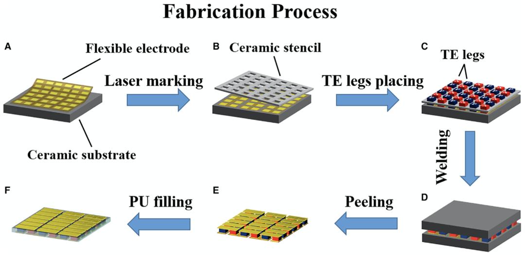 如下图所示,先将 FPCB 电极粘贴在陶瓷基板上,再由激光标记去除多余的 PI 膜(聚酰亚胺薄膜),之后,把 n 型和 p 型 TE 支腿交替布置在陶瓷模板中,将 TE 模块从陶瓷基板上剥离并用 PU 填充。