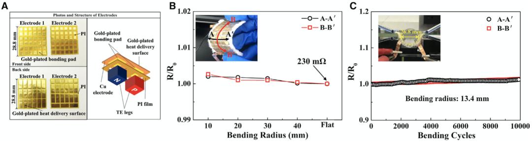 在最终的实验成品中,研究人员设计出了一种具有 18 对 TE 支腿的装置,该装置的总电阻为 230 毫欧姆(mΩ) ,由 TE 脚电阻(210mΩ)和接触层和电极电阻(20mΩ)组成。