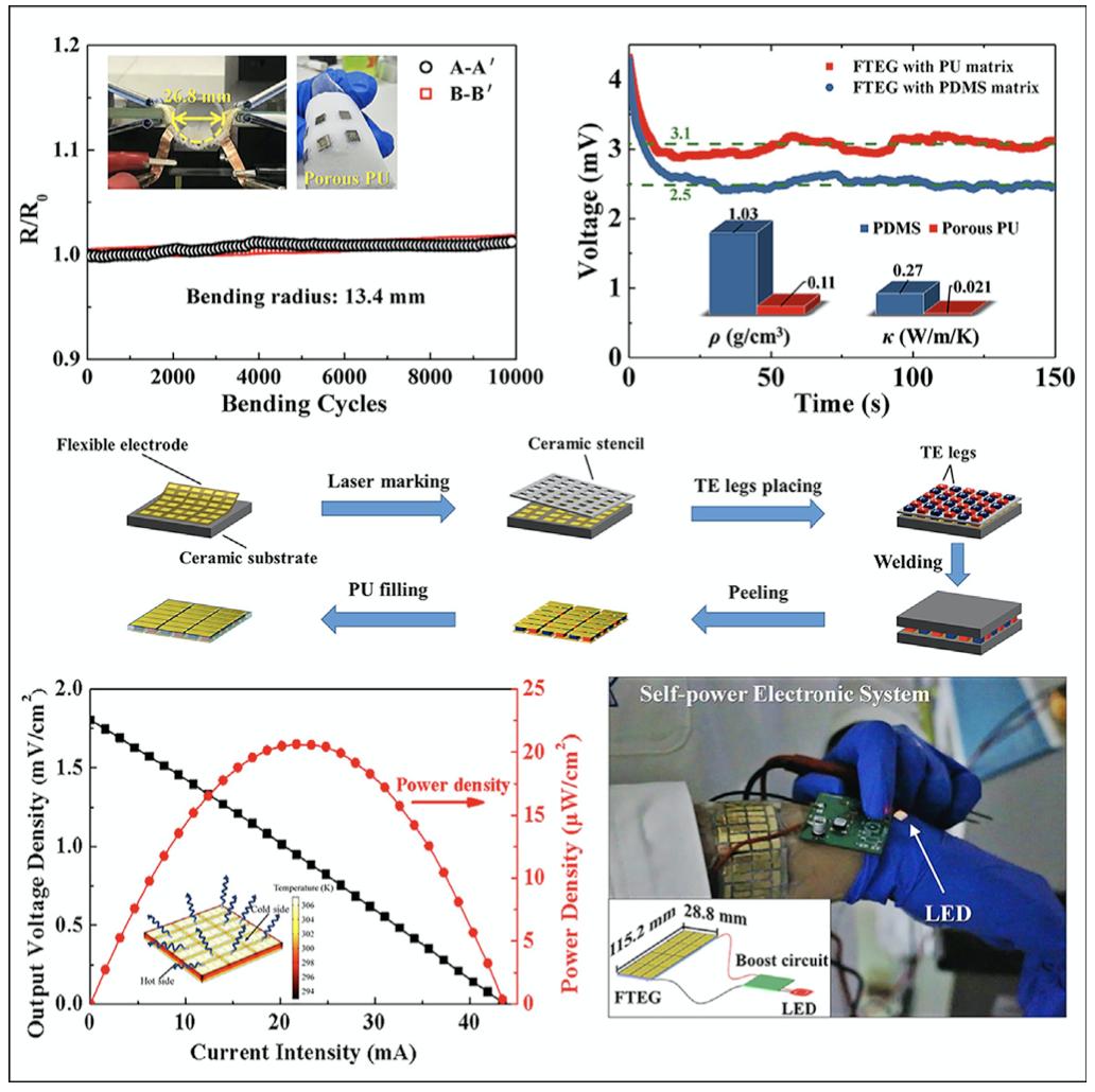 但传统的 TEGs 材料是刚性的,与可穿戴电子设备不好兼容,因此,设计和制造柔性热电发电机(flexible TEGs)成了很多科研团队的目标。