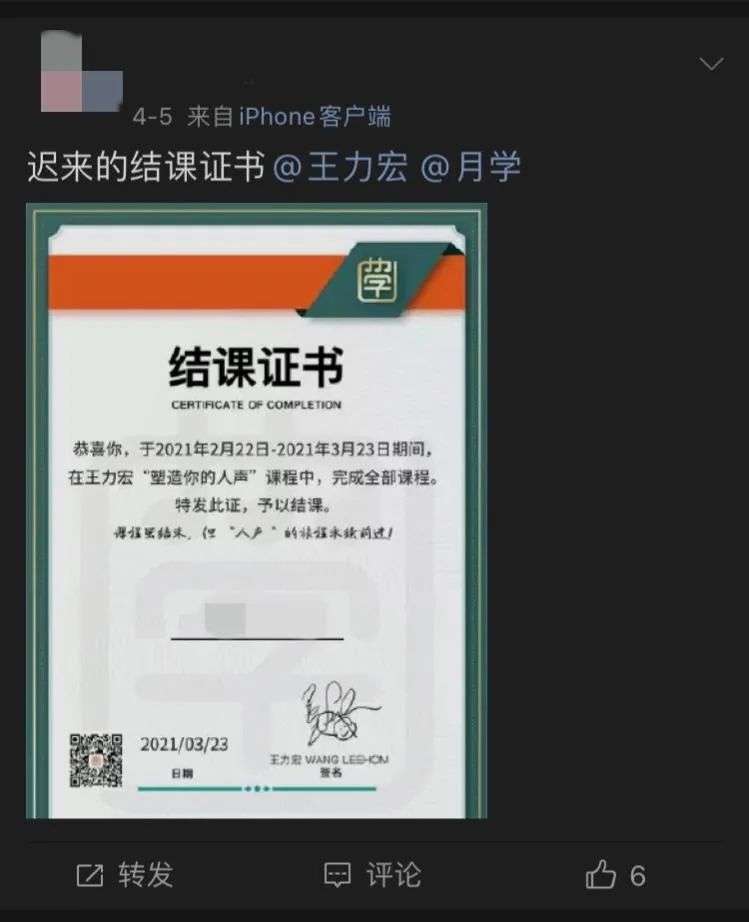 真正吸引魏林报课的不是一纸毕业证书,而是乐学在宣传中提到的“王力宏会在课程中随机挑选学员进行在线指导”。但两万分之一的概率,魏林也没有抱有太希望。