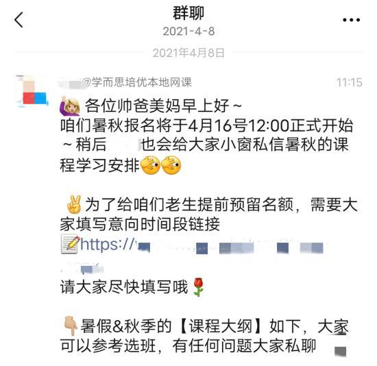 字母榜获得的一份微信群聊天记录显示,4月8日,学而思培优本地网课的一位老师在家长群中宣称,“暑秋报名将于4月16号12:00正式开始”,邀请家长填写意向时间段问卷,并附上暑期和秋季课程安排。