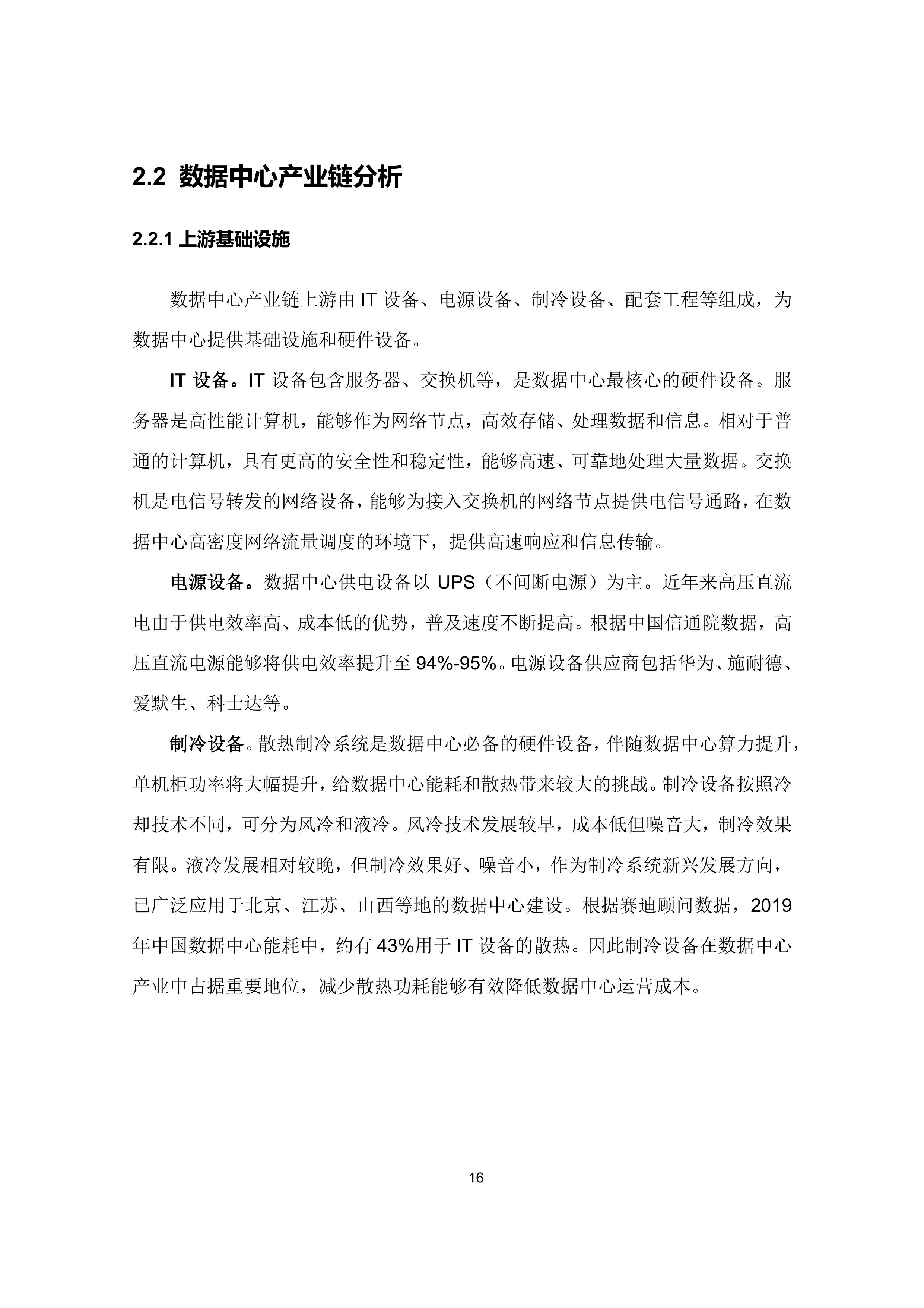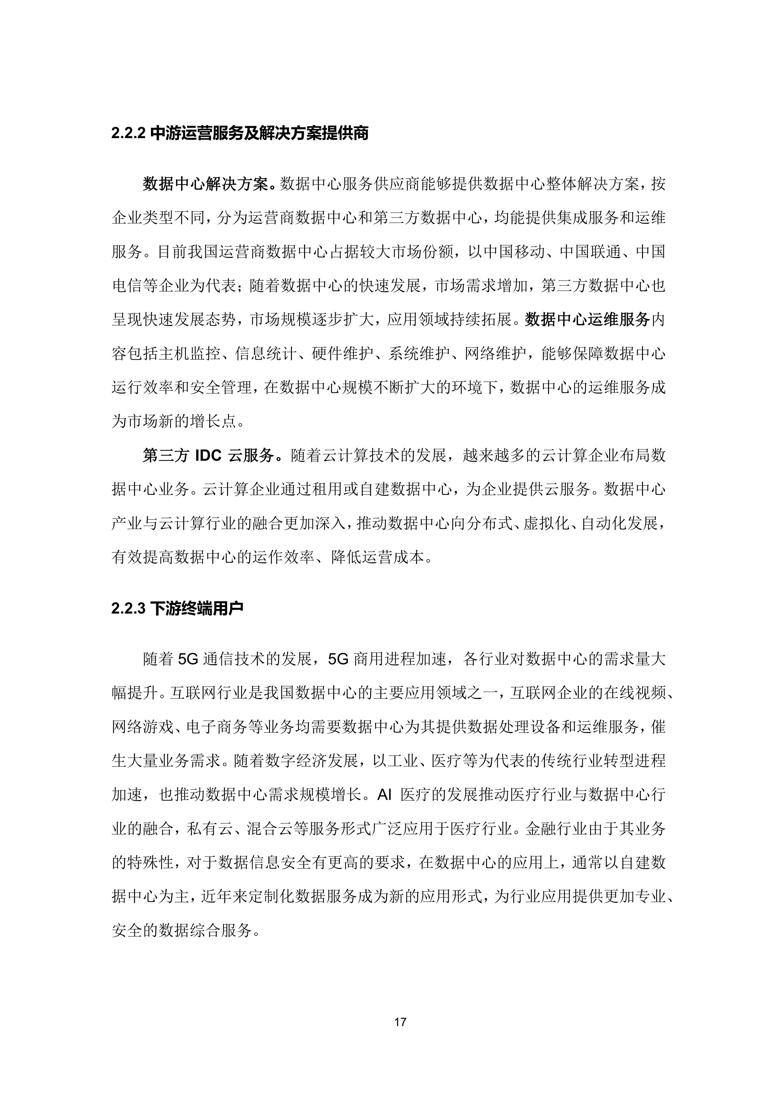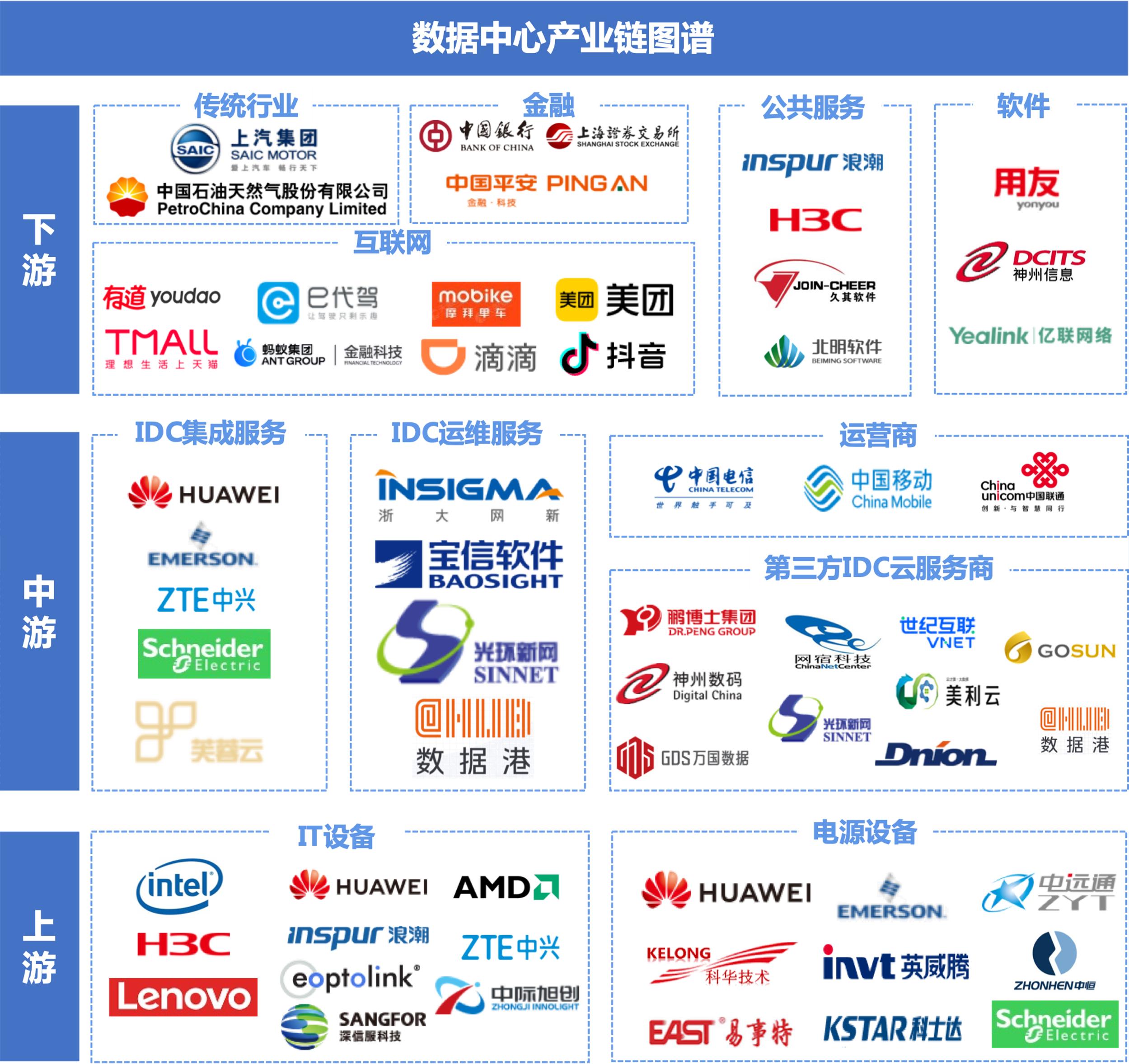数据中心产业链由上游基础设施、中游运营服务及解决方案提供商、下游终端用户三部分构成。基础设施包括IT设备、电源设备、制冷设备、配套工程等,主要提供基础设施和硬件设备等基础保障。中游包括为数据中心提供集成服务、运维服务等整体解决方案以及提供云服务等相关服务的供应商。终端用户渗透多个行业,主要应用于互联网、工业、医疗、金融、公共服务等行业。
