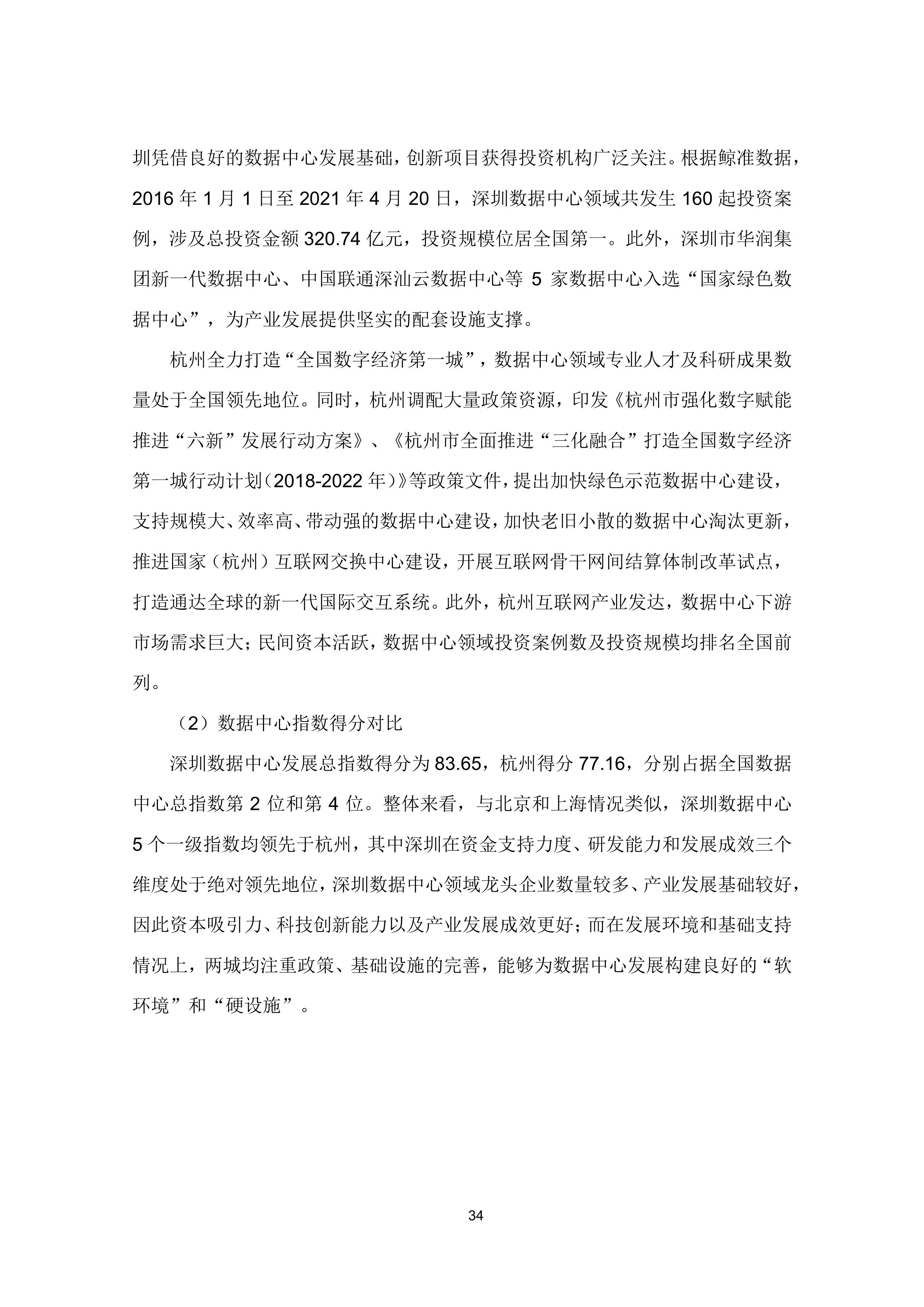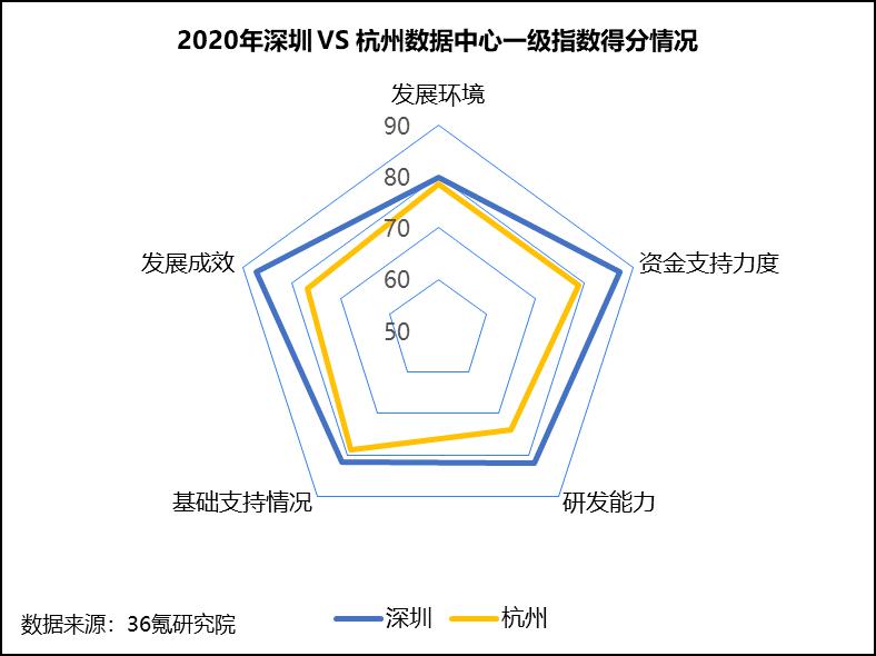 深圳数据中心发展总指数得分为83.65,杭州得分77.16,分别占据全国数据中心总指数第2位和第4位。整体来看,与北京和上海情况类似,深圳数据中心5个一级指数均领先于杭州,其中深圳在资金支持力度、研发能力和发展成效三个维度处于绝对领先地位,深圳数据中心领域龙头企业数量较多、产业发展基础较好,因此资本吸引力、科技创新能力以及产业发展成效更好;而在发展环境和基础支持情况上,两城均注重政策、基础设施的完善,能够为数据中心发展构建良好的“软环境”和“硬设施”。