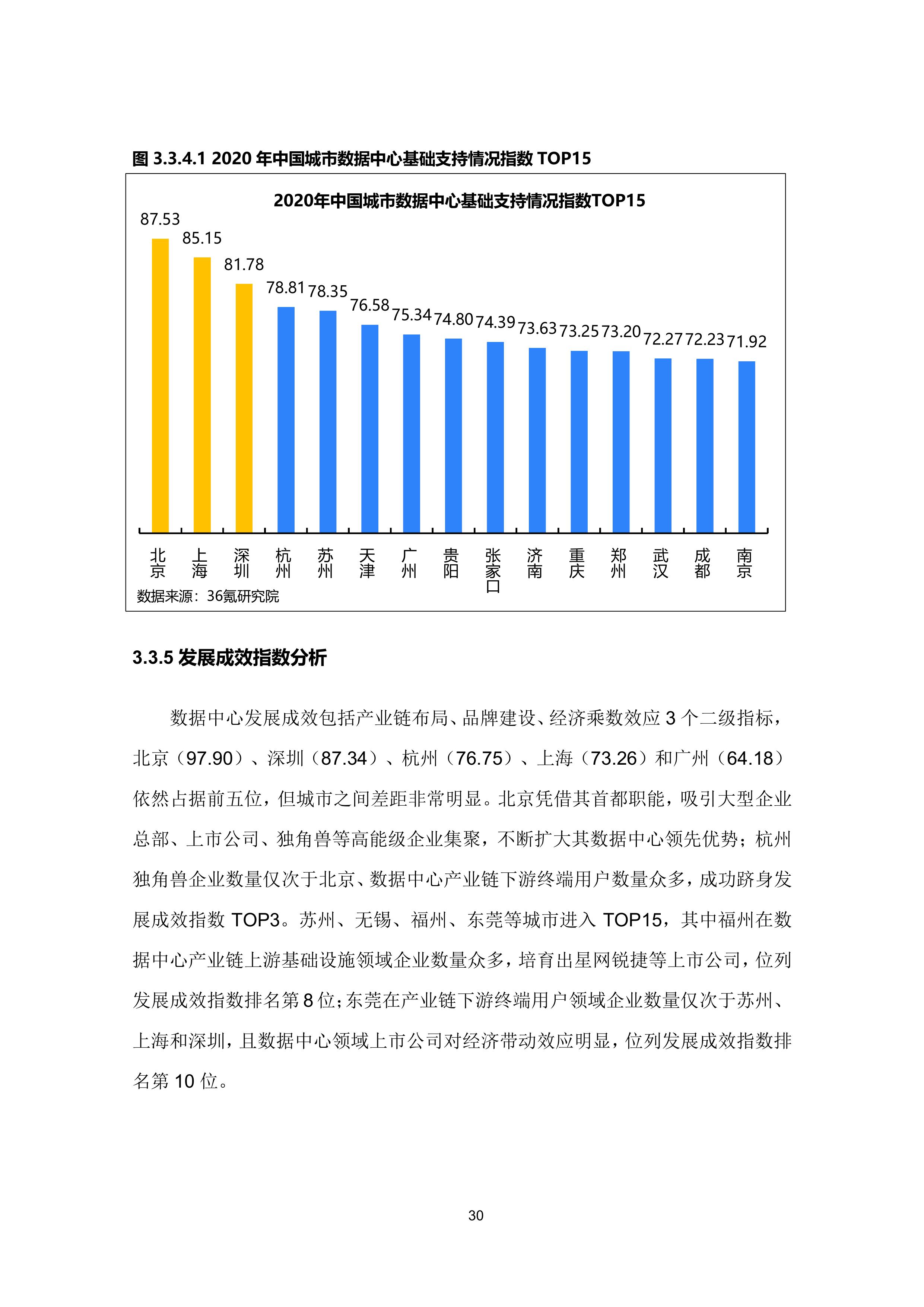 发展环境指数由政策环境、经济环境和交流环境3个二级指标合成。从排名情况看,发展环境指数TOP5城市分别为北京(85.97)、上海(84.10)、深圳(79.76)、广州(79.73)和杭州(78.52),其中北京和上海经济发达、政策支持不断、大型峰会交流频繁,数据中心发展环境优势明显。重庆、济南、成都、福州等城市进入TOP15,其中济南和福州经济增长较快,分别位列发展环境指数排名第7位和第9位;贵阳政府工作报告多次提及“数据中心”等关键词,同时通过发布多项数据中心支持政策、积极开展数据中心峰会等举措促进数据中心发展,位列发展环境指数排名第12位。