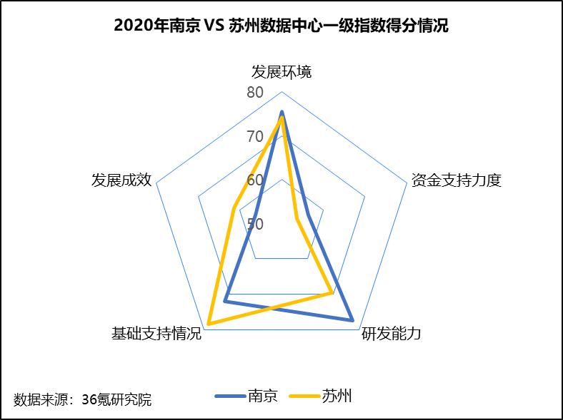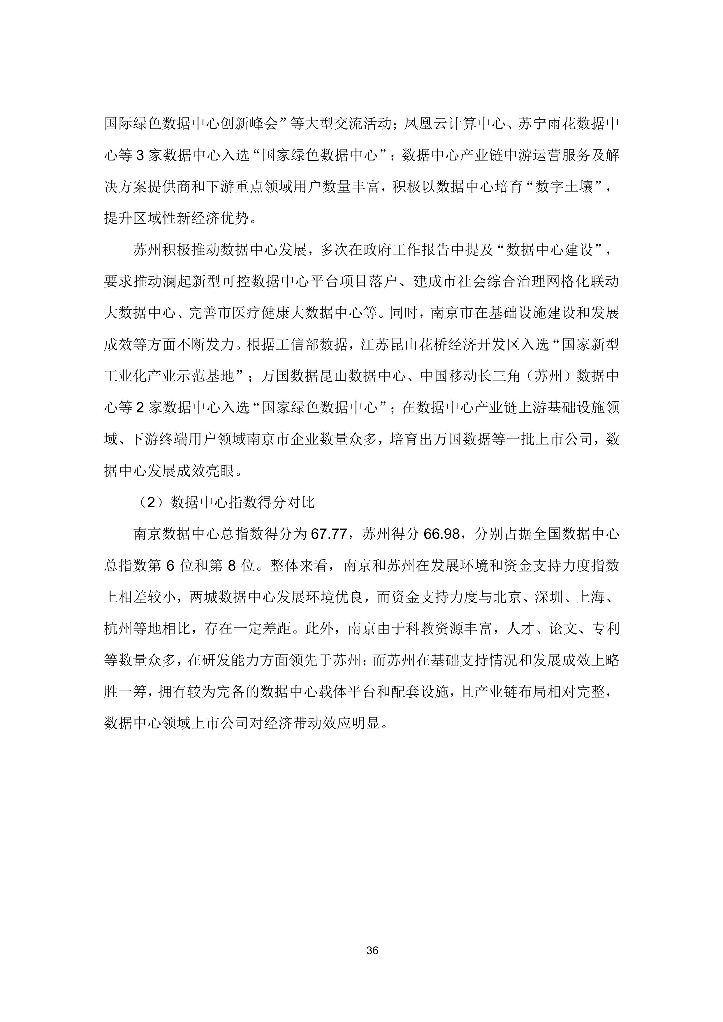 南京数据中心总指数得分为67.77,苏州得分66.98,分别占据全国数据中心总指数第6位和第8位。整体来看,南京和苏州在发展环境和资金支持力度指数上相差较小,两城数据中心发展环境优良,而资金支持力度与北京、深圳、上海、杭州等地相比,存在一定差距。此外,南京由于科教资源丰富,人才、论文、专利等创新数量众多,在研发能力方面领先于苏州;而苏州在基础支持情况和发展成效上略胜一筹,拥有较为完备的数据中心载体平台和配套设施,且产业链布局相对完整,数据中心领域上市公司对经济带动效应明显。