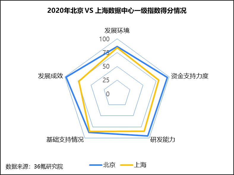 北京数据中心总指数得分为93.16,居全国榜首,上海得分81.46,位列第三名。整体来看,北京数据中心5个一级指数均领先于上海,其中发展环境和基础支持情况两者差距较小,两个城市均通过颁布系列数据中心相关政策、举办大型峰会活动以及建设全球领先的绿色数据中心等,为数据中心发展提供良好的发展环境和基础设施支撑;在资金支持力度、研发能力和发展成效上,北京作为资本最集中、科技最先进、高能级企业最密集的地区,优势明显。