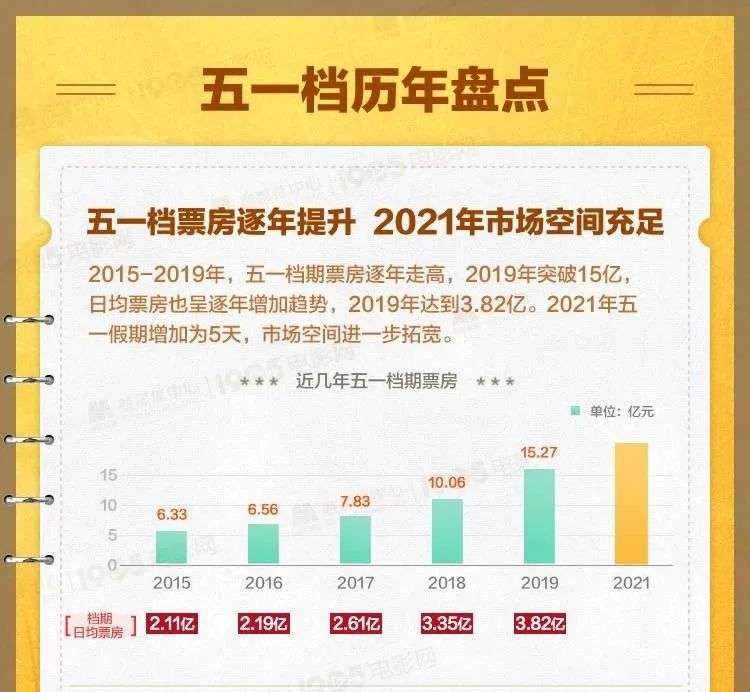 报告显示,2015年至2019年五一档总票房逐年走高,2019年突破15亿,日均票房也呈逐年增加趋势,2019年达到3.82亿。