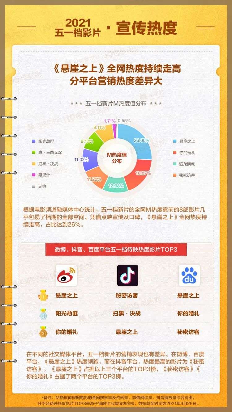 在营销维度,今年五一档,各大影片都是围绕自身的优势点制定宣发策略,如《你的婚礼》更为强调爱情元素,而《悬崖之上》更突出口碑成绩。不过,因各部影片在互联网宣发中侧重的平台不同,分平台营销热度差异也较大。