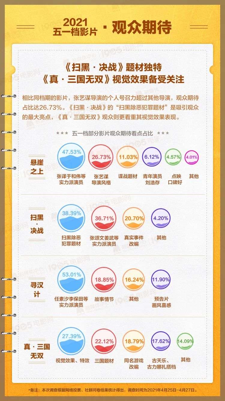 从报告对“2021五一档电影观众期待调查”来看,如今观众选择“想看影片”时的衡量标准已愈发多元,如演员阵容、题材类型、导演风格、视觉效果、故事情节、IP、预告片等都是观众考虑一部影片的要素。