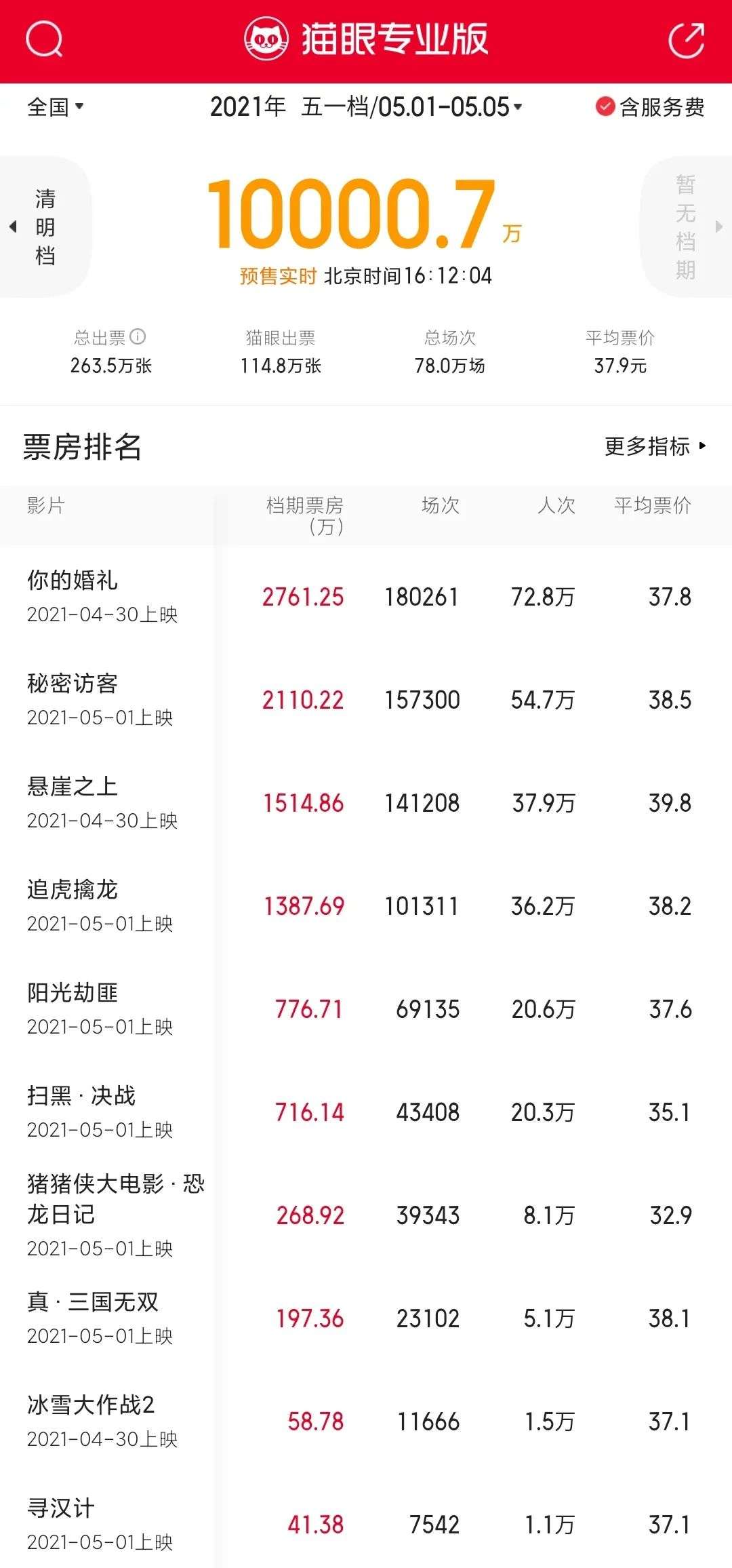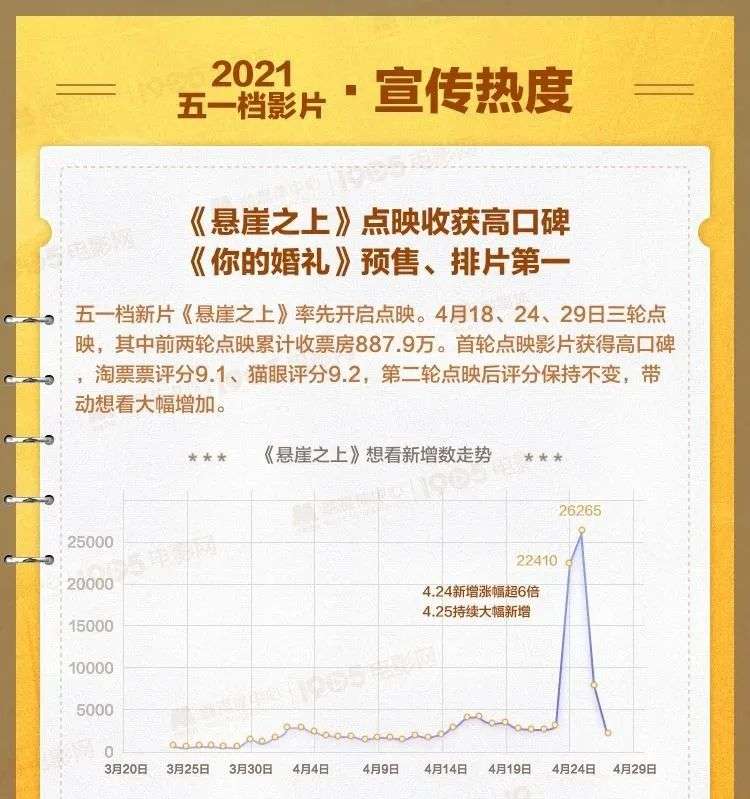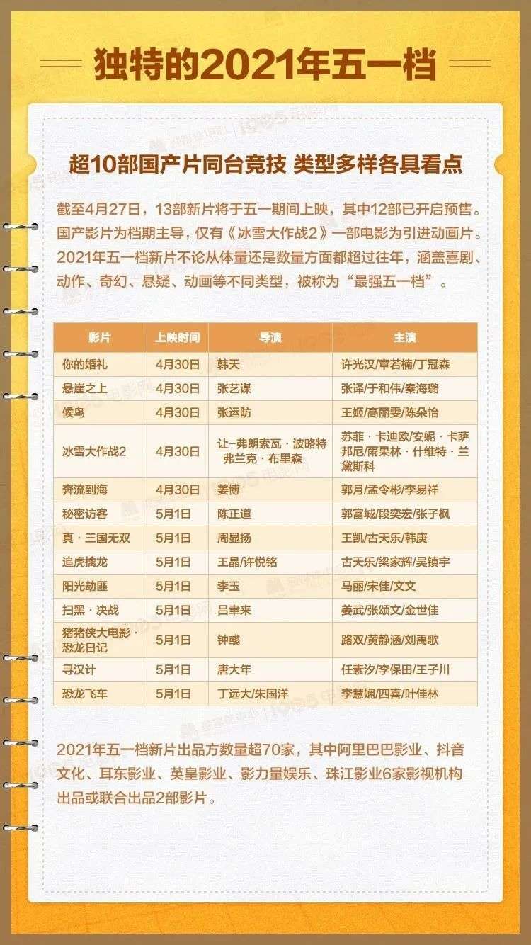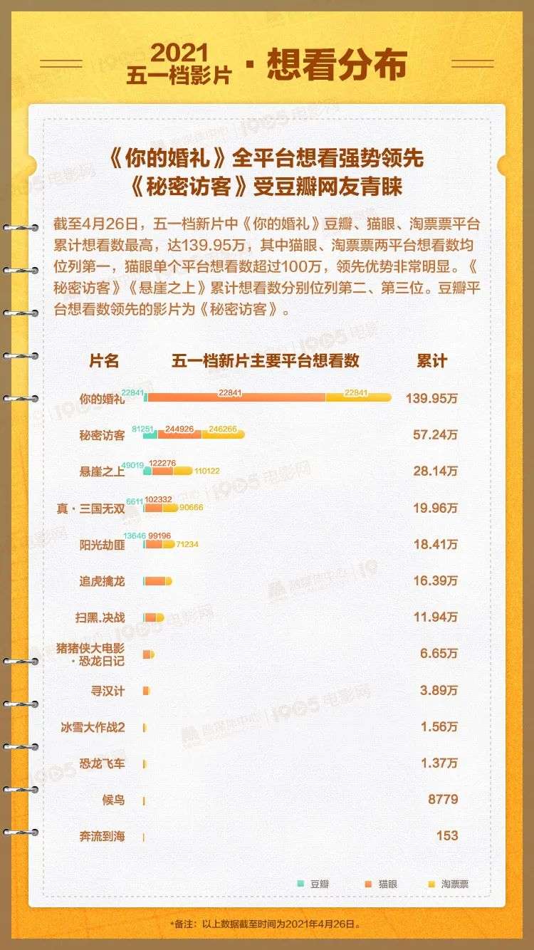 2021年,选择在五一档上映的新片达到了创纪录的13部。截至28日18时,《你的婚礼》《悬崖之上》《秘密访客》等五一档新片的总预售已突破2亿(含4月30日票房),其中5月1日-5日的档期总预售破亿。