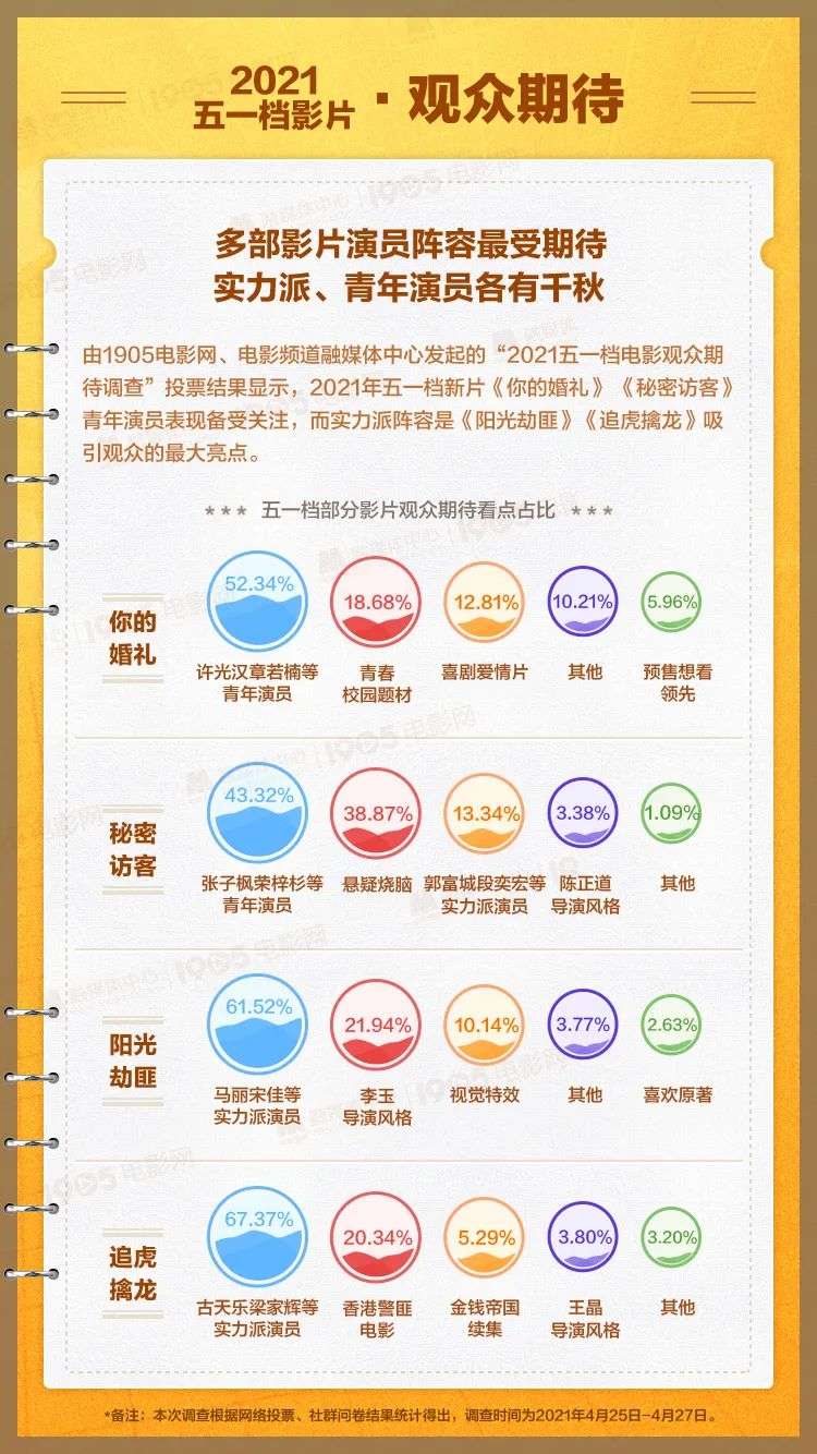 五一档8部影片的观众期待看点占比中,有6部影片的最大看点是“演员阵容”,如《你的婚礼》《秘密访客》中的章若楠、许光汉、张子枫等青年演员为两部影片贡献了52.34%和43.32%的看点占比,而张译、于和伟、任素汐、李保田等实力派演员也是《悬崖之上》《寻汉计》等影片的重要看点。