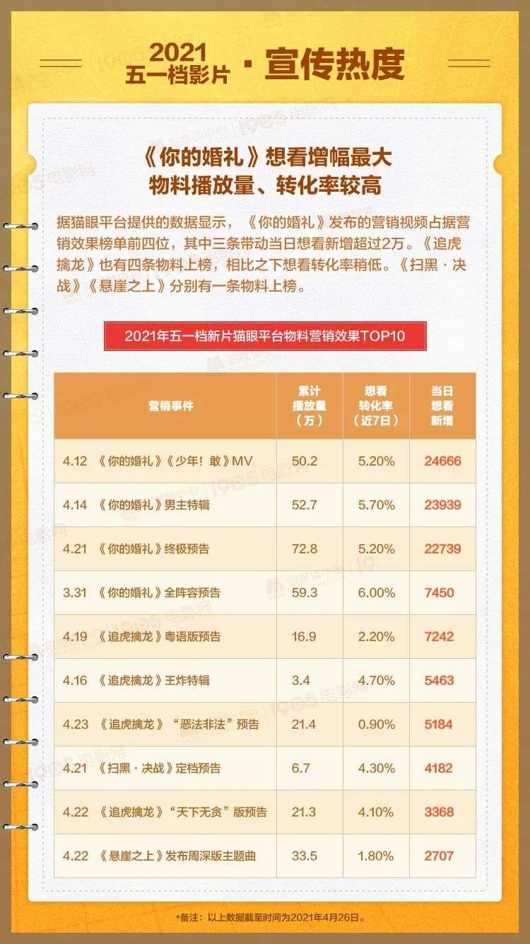 从“五一档新片猫眼平台物料营销效果TOP10”榜单来看,《你的婚礼》发布的营销视频占据物料营销榜单前四位,其中男主特辑、终极预告等内容带动当日想看新增超过2万人。排在《你的婚礼》相关物料后面的,便是《追虎擒龙》的粤语版预告、王炸特辑、“恶法非法”预告。