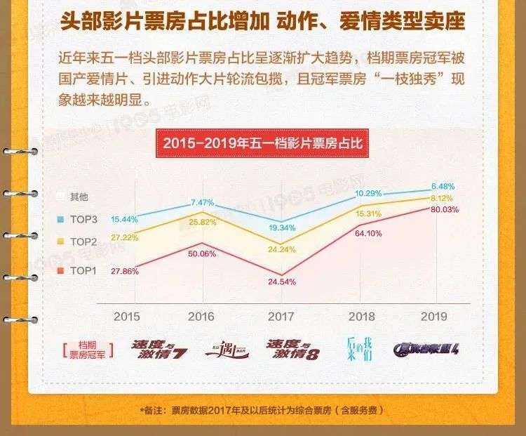 从报告来看,近年来五一档头部影片票房占比呈逐渐扩大趋势,档期内TOP3影片贡献票房占比从2017年的68.12%一路上升到了2019年的94.63%,这无疑是一个接近残忍的比例。