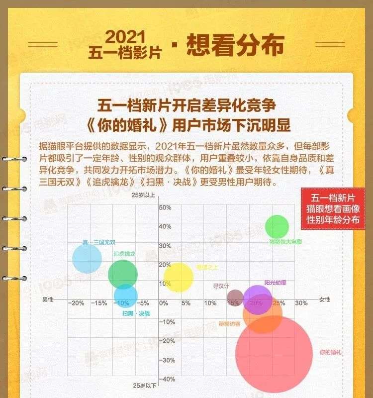 根据猫眼提供的想看用户画像来看,五一档新片数量虽多,但每部影片都吸引了一定年龄、性别的观众群体,用户重叠度较小,这也意味着各类影片都有着属于自己的市场空间和差异化竞争力。