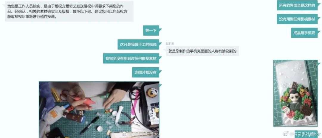 但是,二创创作者发现被下架的视频中,有些并不属于这个范畴。一位匿名创作者投稿说,自己拍摄一则DIY手机壳的视频,由于使用了《大宋少年志》的角色作为卡通形象而要求被下架。