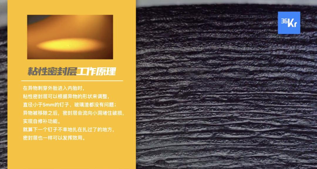 在自修补轮胎中的异物被移除之后,特殊涂层混合物的密封层会流向被扎破的小洞堵住破损处,实现自修补的功能。
