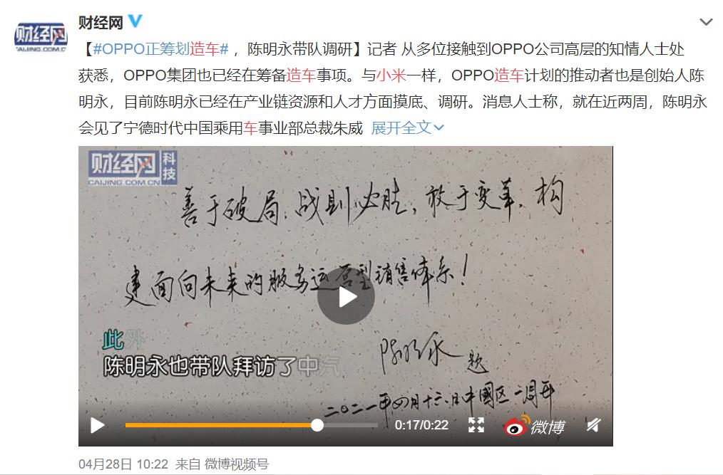 据36氪报道, OPPO 也有造车的计划,且正在对产业链资源和人才进行摸底、调研。OPPO创始人陈明永还在近日会见了宁德时代中国乘用车事业部总裁。