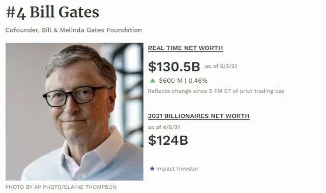 根据福布斯实时富豪榜,截至当地时间5月3日,比尔·盖茨身价达1305亿美元,排名全球第四。仅次于亚马逊(NASDAQ:AMZN)首席执行官杰夫-贝索斯(Jeff Bezos)、路易威登老板伯纳德-阿尔诺(Bernard Arnault)和特斯拉(NASDAQ;TSLA)首席执行官埃隆-马斯克(Elon Musk)。与贝索斯不同的是,比尔·盖茨的财富构成可能更加复杂,前者的财富主要集中在亚马逊股票上,而比尔·盖茨的净资产源于微软,但时至今日,微软股票在他资产中所占比例可能还不到20%。