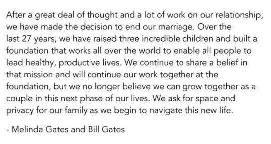 比尔·盖茨写道:“在对我们的关系进行深思熟虑并做了大量工作之后,我们已经作出了终结婚姻关系的决定。在过去27年时间里,我们养育了三个非凡的子女,并建立了一个基金会,在全球范围内展开工作,来让所有人都能过上健康的、多产的生活。我们对这个使命仍有共同的信仰,并将继续共同做这个基金会的工作,但不再认为在我们生活中的下一个阶段里,我们还能一起成长。在我们开始过这种新生活之际,我们想要空间和家人隐私。”