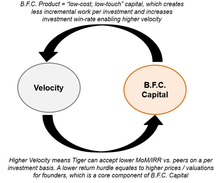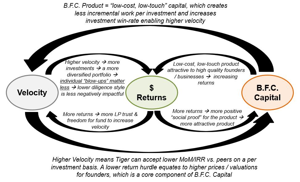 在速度<> BFC这个飞轮保持完好的情况下,老虎基金可以为创始人提供比竞争对手出价更高的估值,比其竞争对手提供更多的投资,从而带来可观的投资收益。老虎基金已经开发出风投第一款结构性的、非品牌驱动且可产生规模飞轮效应的产品。他们抛弃一堆关于风险/成长基金应该怎么做的陈规旧套,代之以一套能够在自己地盘上跟VC竞争的系统。这就是老虎正在蚕食VC的原因。