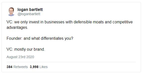 风投:我们只投资有防御性护城河以及具备竞争优势的企业。创始人:你的差异化优势是什么?VC:主要是我们的品牌。