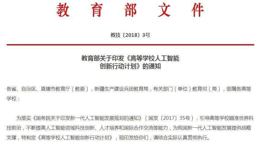 中国科学院大学在我国高校中率先成立人工智能技术学院,随后,2018年,教育部印发了《高等学校人工智能创新行动计划》,上海交大、南京大学、清华大学、哈尔滨工业大学、南京航空航天大学、南京理工大学、南京邮电大学等相继成立人工智能研究院或学院。