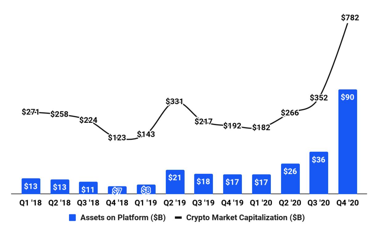 他们的交易收入趋势是一个混合体,短期内令人难以置信的乐观,随着时间的推移,产生了更多的问题。Coinbase将其平台上约0.67%的交易价值作为收入;在第四季度,这意味着870亿美元的交易额产生了4.97亿美元的交易收入。相比之下,纳斯达克公司在2020年产生的市场服务净收入为11亿美元,每天约3000亿美元的现金股票交易量。
