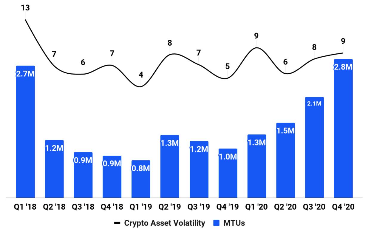 他们的交易收入对加密货币的波动高度敏感。S-1的这张图就说明了这一点,以他们的月交易用户为基准,衡量加密货币价格的变化程度: