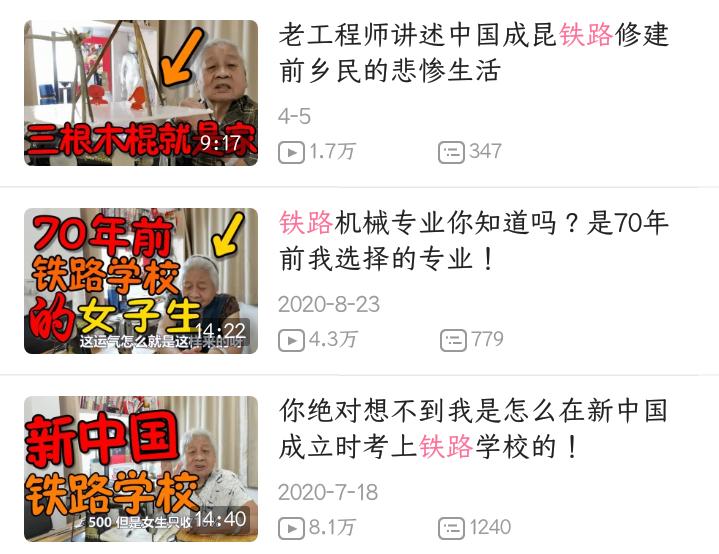 而且,尽管他们的内容和形式看起来平平无奇,但却常常散发着独特的平凡魅力。例如前文提到的敏慈奶奶,她的身份是一名退休铁路工人,所以她在视频中的讲述很多也都与此相关。