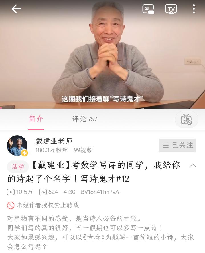 例如在B站上普及古代文学知识的戴建业老师,不仅讲李白讲杜甫,还特意把评论区网友们创作进行收集,在“写诗鬼才”系列视频中加以展示,形成了一种特别的互动仪式。