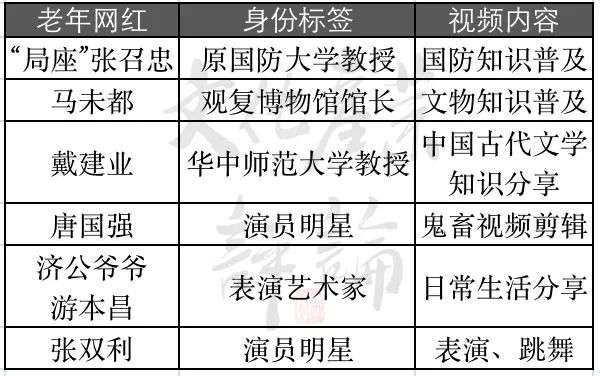 而在名人明星型“银发网红”中,最为突出的两类是专事知识传播的“高知网红”和日常放松消遣的“娱乐网红”,这既是他们视频内容的创作核心,也是他们为大众所熟知的老年形象。