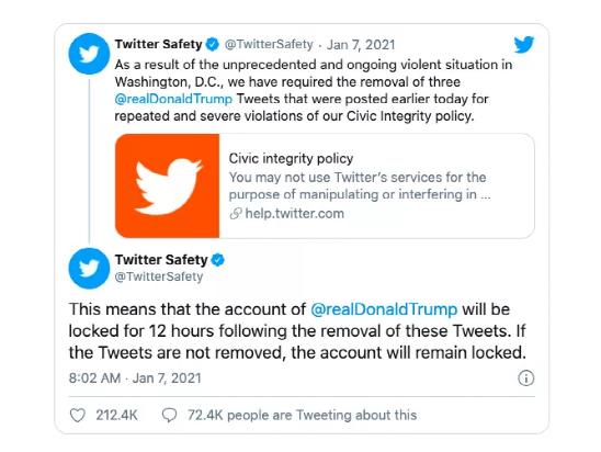 在国会暴乱发生之后,Twitter第一个站出来封了川普的账户,阻止他向8800多万粉丝发消息。