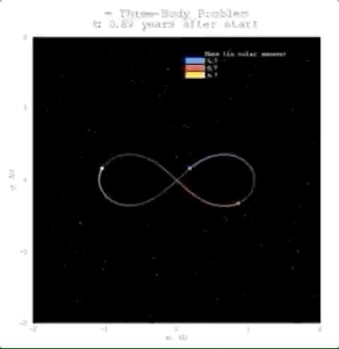 后来,有了计算机的帮助,科学家们能够计算出更多三体问题中,一些存在周期性的特殊解。