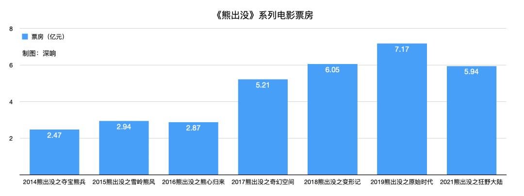 相比于日渐式微的喜羊羊,熊出没则正在“壮年期”。2014年,熊出没的第一部电影《熊出没之夺宝熊兵》在《喜羊羊》、《神偷奶爸》等动画片的夹击之下三天过亿,之后票房也非常稳定,近几年的票房水平更是都在5亿以上。