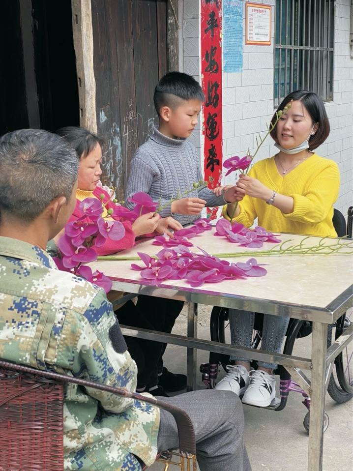 图为杨淑亭帮助乡亲们组装仿真花