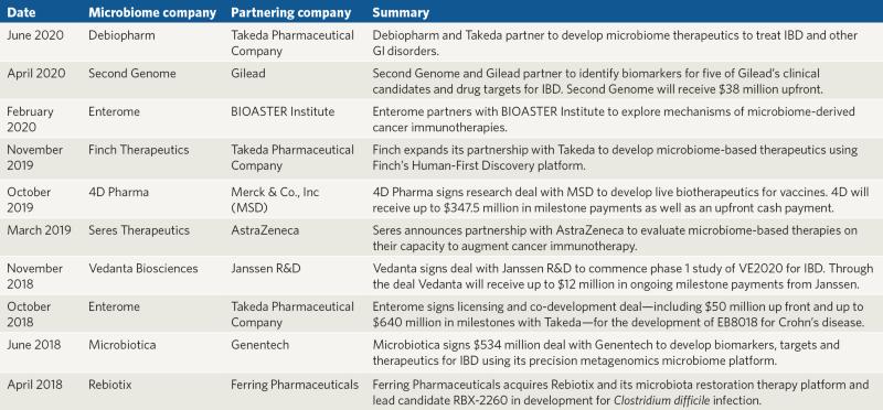近年来,包括Merck and Co.、Gilead、强生等大型制药公司也在这一领域的初创公司方面紧步投资和。比如将微生物遗传学研究转化成阻断病人和细菌之间分子作用的化学药物的Second Genome获得了Gilead和罗氏风投基金的战略投资。武田制药与生物制药公司Debiopharm签订独家协议展开研究来开发新型微生物组疗法治疗炎症性肠道疾病,武田还投资了以人体微生物种群入手开发胃肠道疾病药物的公司Enterome。