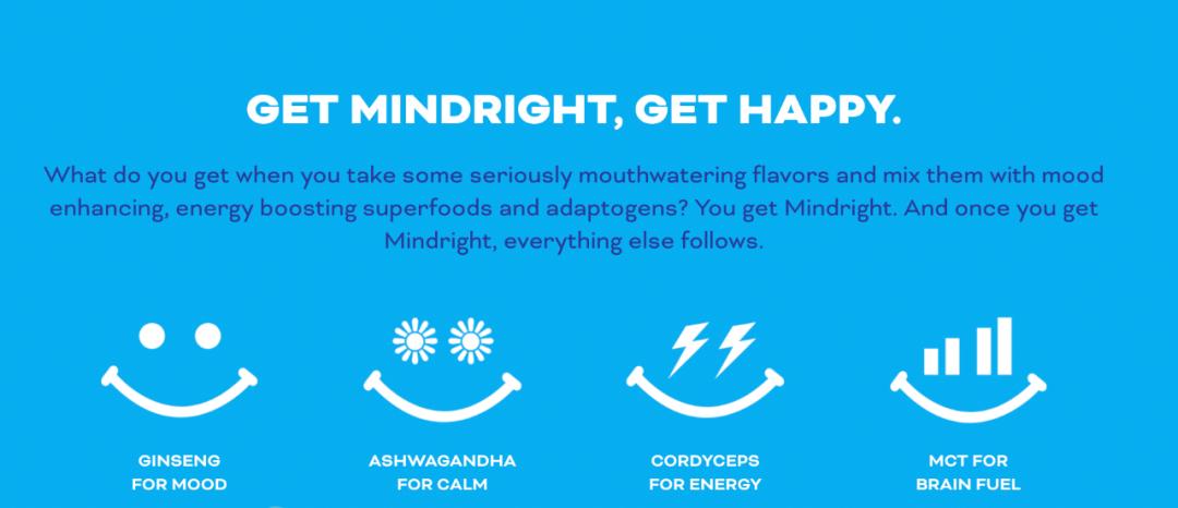 Mindright产品用的就是简单的能量棒的形式,但原料却大有学问,包括让人平静的印度人参、提升心情的人参、让大脑动起来的中链甘油三酯(MCT)和提供能量的冬虫夏草,一个只有210卡,严格素食主义者和无麸质饮食都可以放心食用。