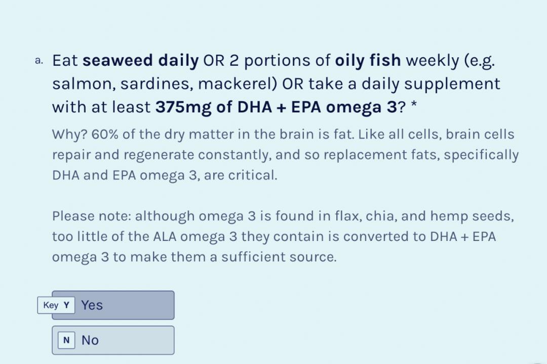用户会首先进行一个4分钟的关于“脑健康”的问卷调查,问题涉及近来的心情、饮食、睡眠、保健品摄入、运动、冥想等情况,从而得到如何提升的建议,目前大多数人的脑健康平均成绩只有51分。