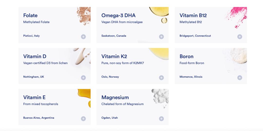 用户也可以通过网站上对包括益生菌、维生素、矿物质等多种产品的详细介绍自行添加单品,Care/of也在一直不断添加品类,孕期、运动、消化、助眠等都有特定的产品。
