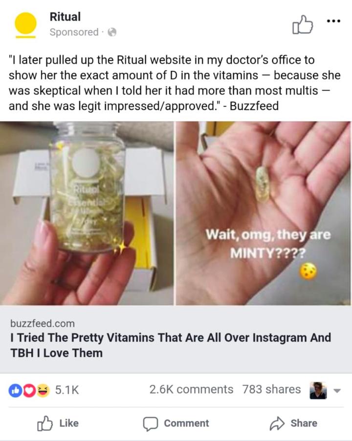 作为DTC品牌,Ritual毫不吝惜的利用了社交渠道来和消费者交流,在Facebook、Instagram、Twitter上回应每个关于维生素的问题,将这份透明延续到底。