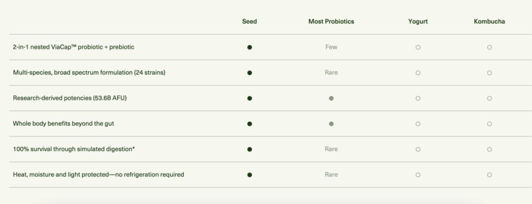 Seed则是一个更加“亲民”的选择,通过临床试验、GI刺激模式、细胞测试、基因组测序等多种测试和顶尖医学博士团队的努力,为用户打造出了一款每日口服益生菌保健品,对比一下就能看出Seed产品的质量,不是普通益生菌产品和区区酸奶能比的👇