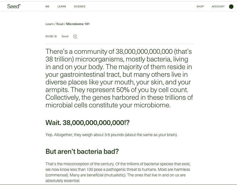 用户无需读复杂的医学研究著作,只需要购买这一款就够了,但若想要了解更多,Seed也会提供肠道微生物101和益生菌101等笔记供深度学习。Seed还在今年2月收购了数字健康公司Auggi,将用它的AI算法和粪便图像分析技术更好监测患者的肠道健康,也代表着这一领域将AI视作提供批量化定制解决方案的主要工具。