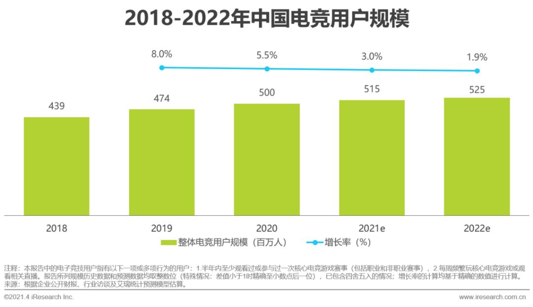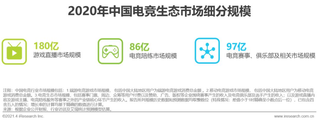 市场:2020年电竞整体市场规模超过1450亿元,增长主要来自于移动电竞游戏市场和电竞生态市场的快速发展。预计在2021年电竞市场将突破1800亿元。