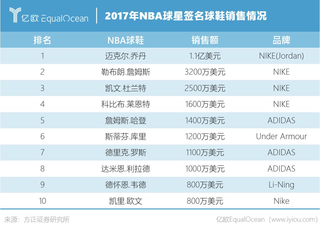 根据方正证券研究所统计,从2017年NBA球星签名球鞋销售情况来看,“吸金力”最强的前十名的球星几乎都被阿迪、耐克达斯收入麾下,李宁抢到的只有德怀恩·韦德。