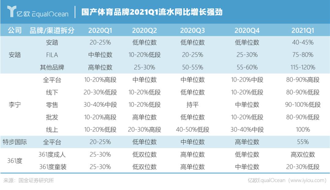 2021年一季度,李宁销售点(不包括李宁YOUNG)在整个平台的零售流水同比录得80%-90%高段增长。中金公司、安信国际、美银证券等多家机构认为,李宁2021一季度销售额预计较2019年同期上升超过50%,是内地运动服装品牌中录得最大增长之一。