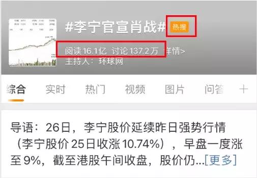 还有前段时间新疆棉花事件后,李宁宣布肖战为代言人,虽然这一行为在知乎被喷为“作死”,但是官宣之后,微博话题#李宁官宣肖战#讨论量超过 10 亿;