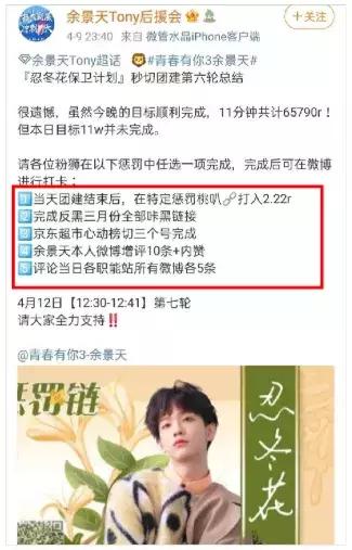 如果目标没有完成,后援会还会对粉丝提出惩罚,这惩罚包括但不限于为爱豆刷数据和打钱。
