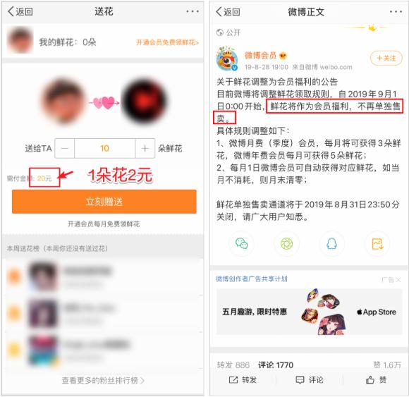 当然,在整改之下,微博的鲜花机制已经做了“优化”,曾经需要粉丝 2 元 1 朵花真金白银刷出来的「爱慕值」,现在变成会员专属福利。