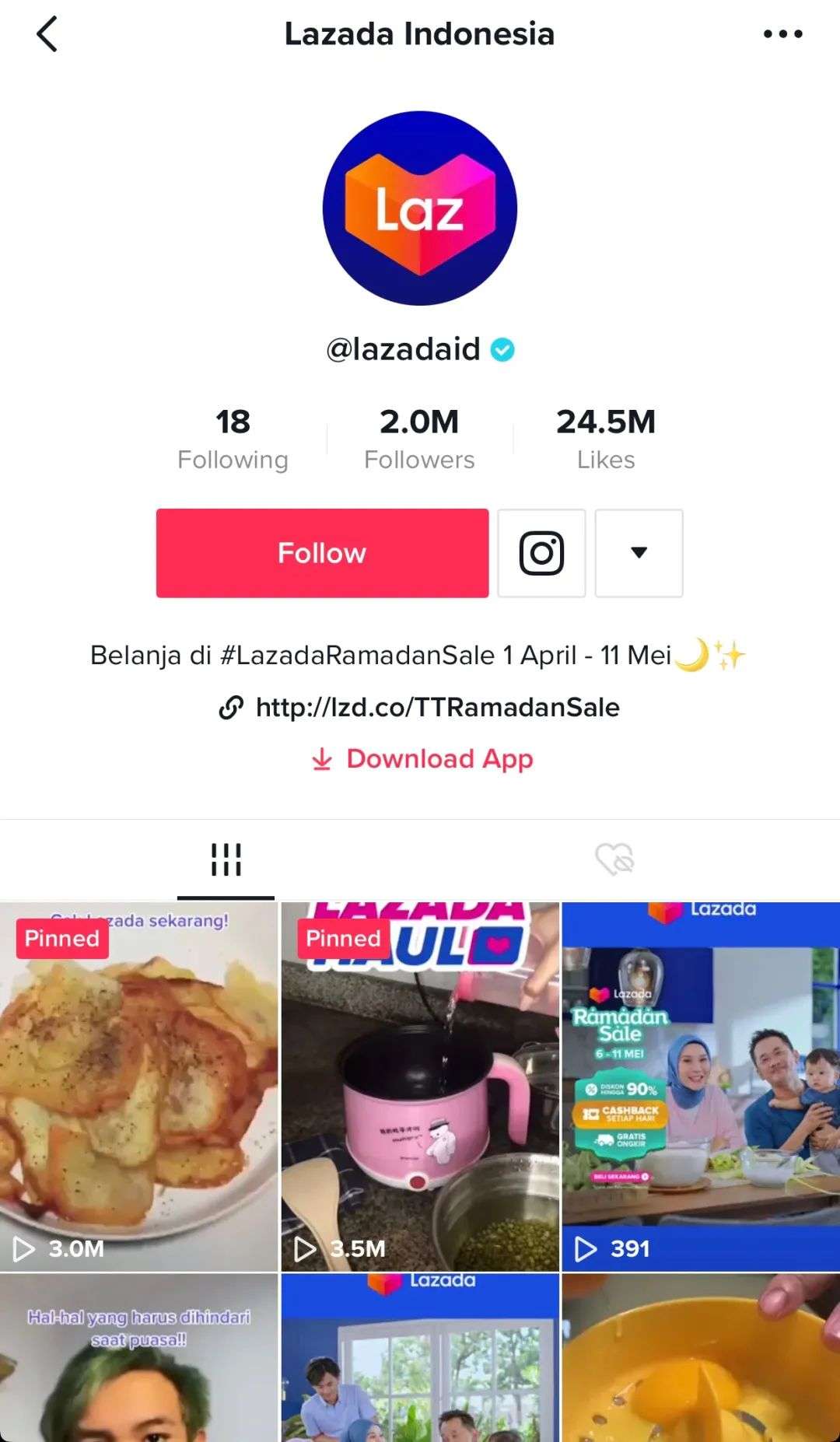 相比而言,Lazada的TikTok企业号则进入了相对更成熟的运营阶段,内容发布频繁(如Lazada印尼站从2020年3月至今已发布近1000条短视频,积累了200万粉丝和2450多万次点赞,最热门的一条视频播放量达到了2000万),账号主页均可跳转至Lazada网站购物,并可直接导向应用商店下载其APP。