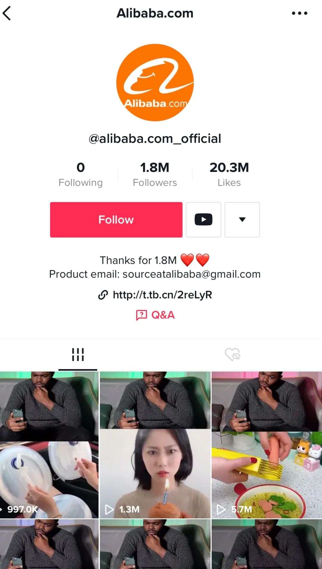 亿邦动力获悉,阿里旗下三大跨境电商平台——阿里巴巴国际站、全球速卖通、Lazada,都在TikTok开设了企业号,并通过在账号主页附链接的方式,向自己的网站引流。